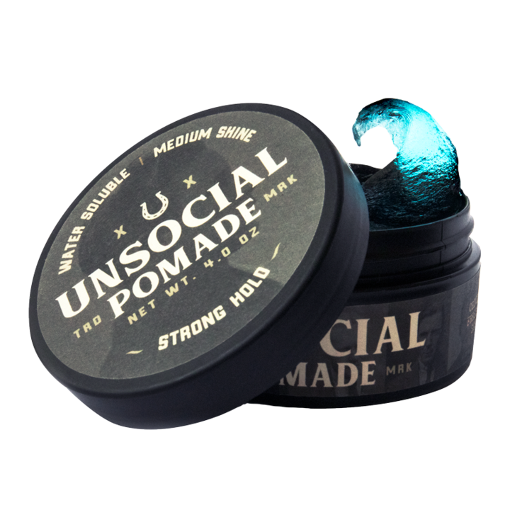 Unsocial Co’s Pomade is a solid all day hold Water Soluble Pomade with Dead Sea Minerals, Jojoba Oil and Green Tea Extract promoting hydrated, strong Hair and a healthy scalp.